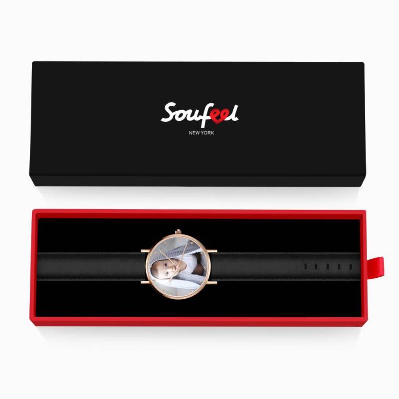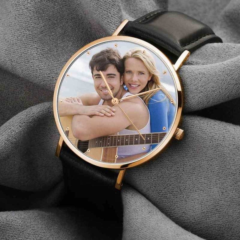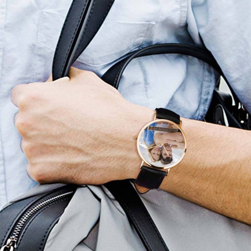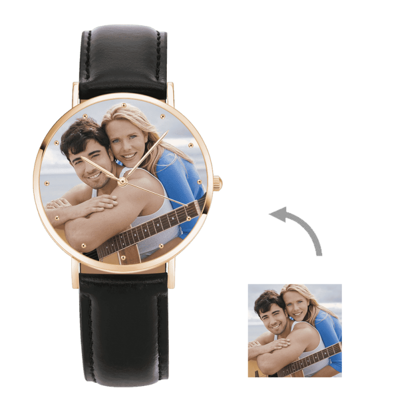 Custom Watch Engraved Rose Gold Photo Watch Black Leather Strap