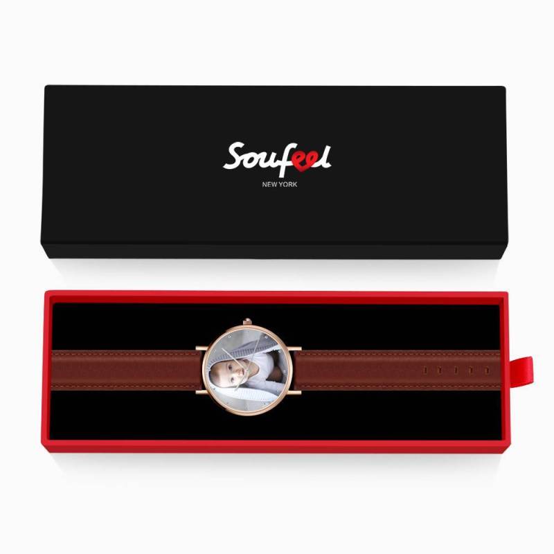 Custom Watch Engraved Rose Gold Photo Watch Brown Leather Strap