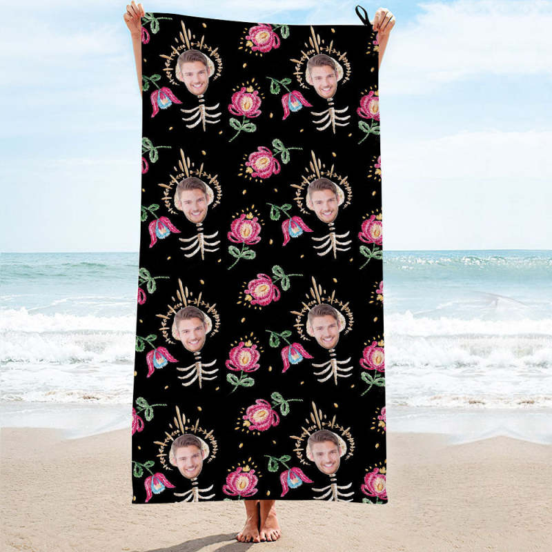 Custom Face Bone Flowers Beach Towel Personalised Photo Beach Towel Funny Gift