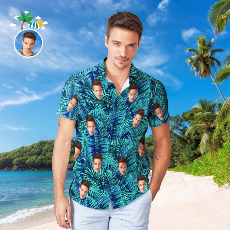 Custom Face Hawaiian Shirt Men's Popular All Over Print Hawaiian Beach Shirt Holiday Gift - Green Leaf