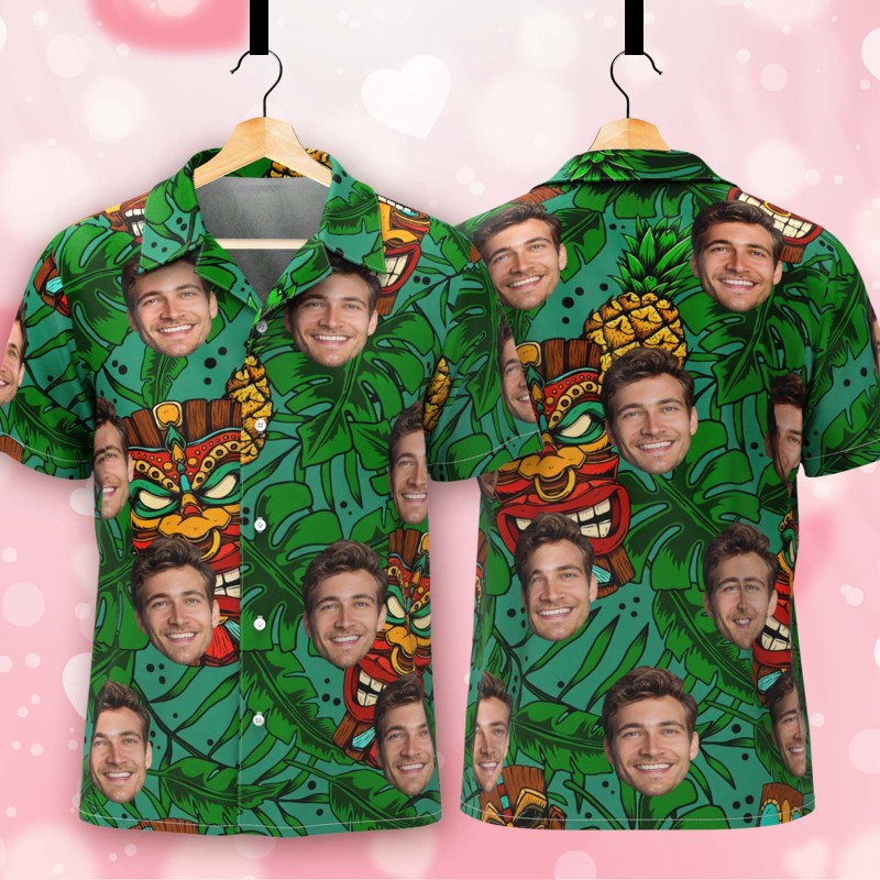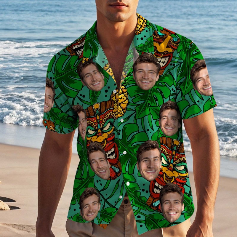 Custom Face Tiki Hawaiian Shirt Tropical Green Vacation Aloha Beach Shirt for Men, Funny Summer Gift
