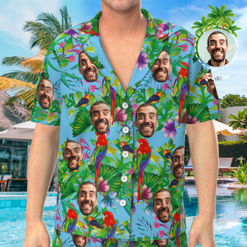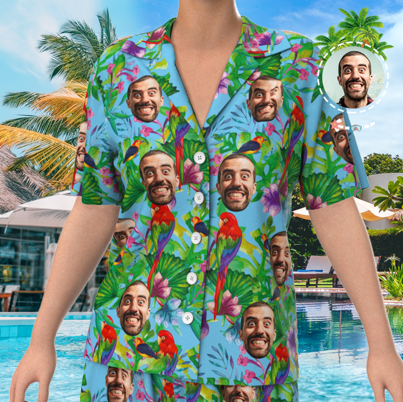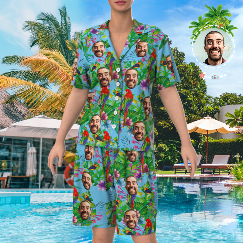 Custom Face On Pajamas, Short Sleeve Sleepwear, Button-Down Nightwear - Parrot