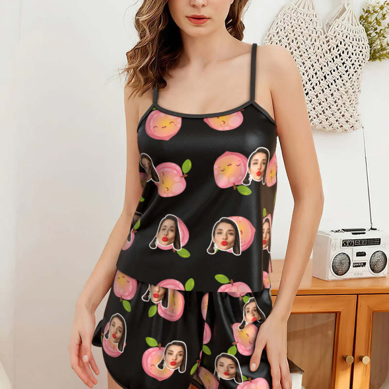 Custom Face Pajamas Suspender Sleepcoat Shorts Lingerie Set Summer Sleepwear - Peach