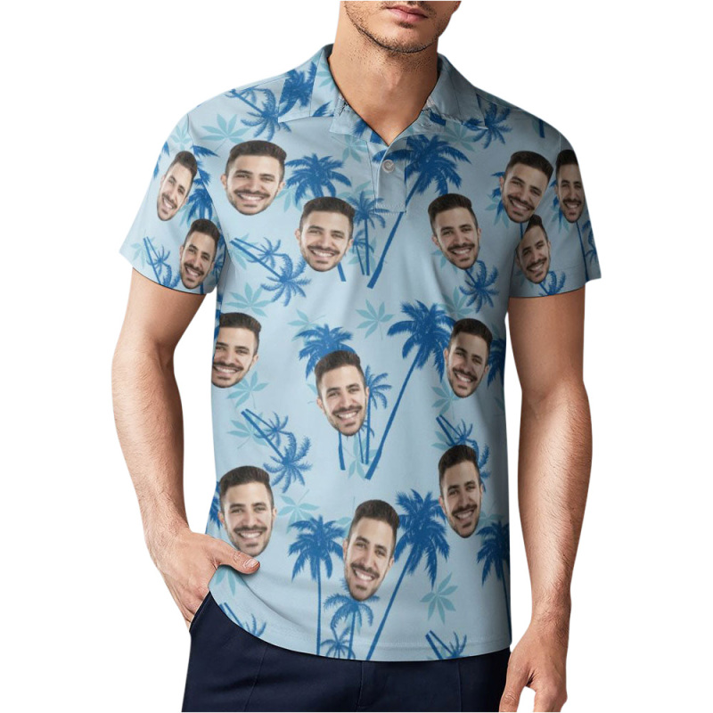 Custom Face Polo Shirts For Men Light Blue Hawaiian Style Golf Shirts