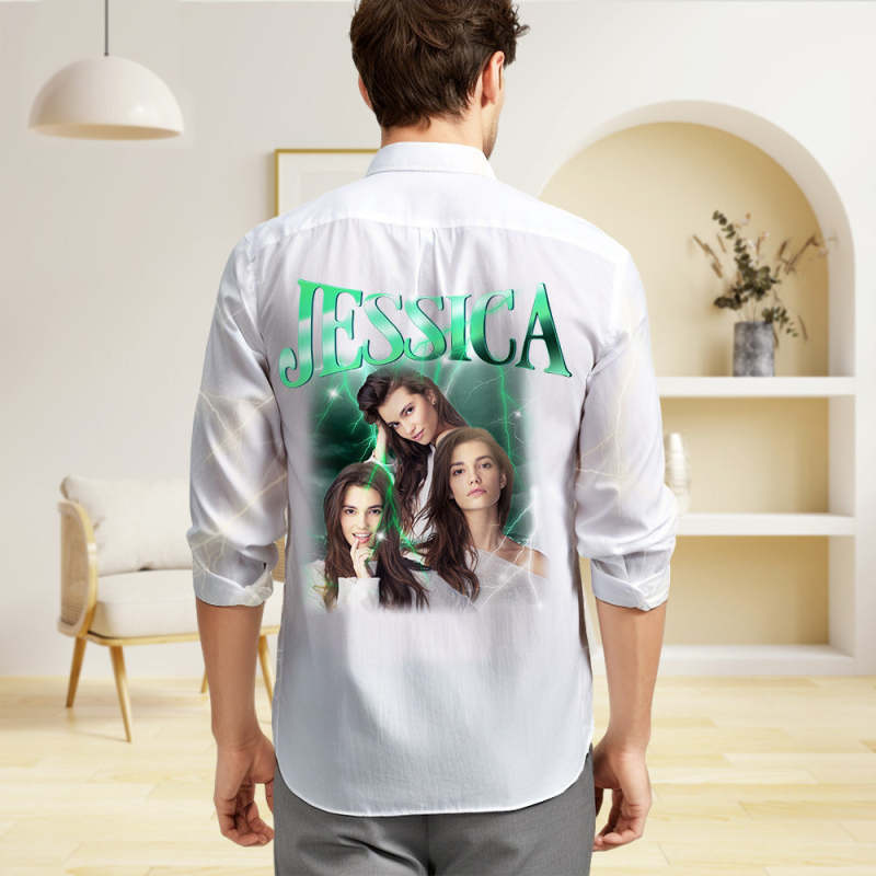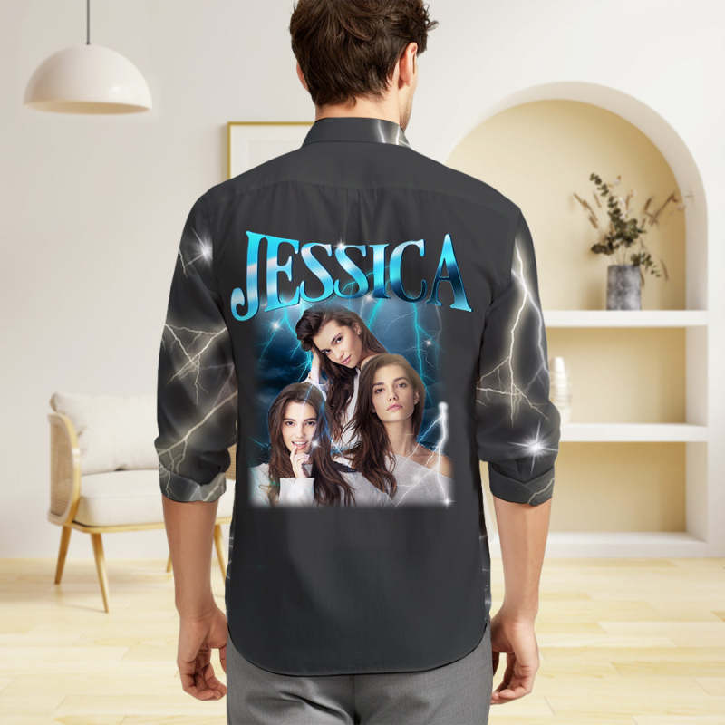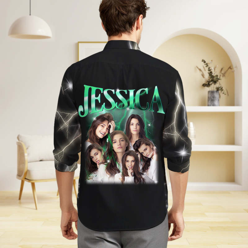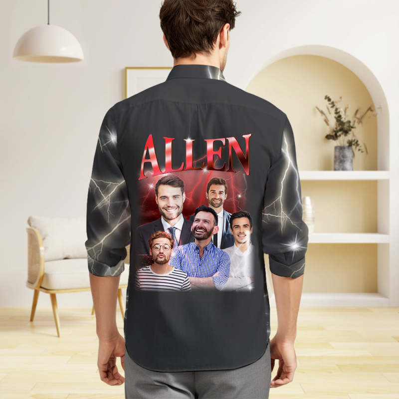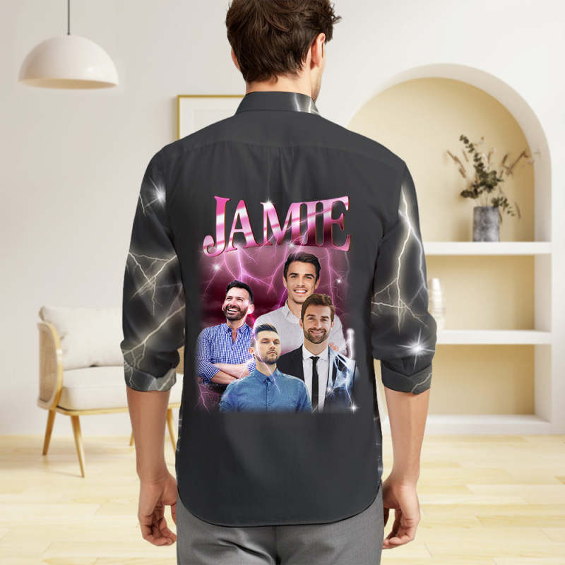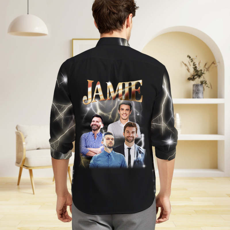 Custom Photo and Text Long Sleeve Shirts Personalised Photo Gift Men's Vintage Personality Lightning Shirts