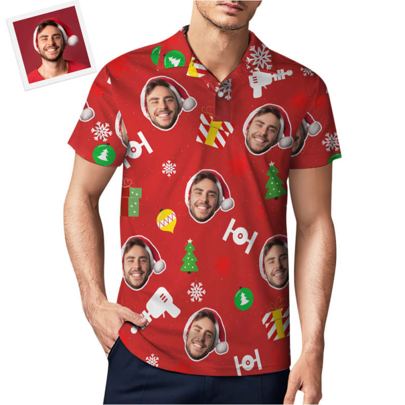 Custom Photo Red Short Sleeve Polo Shirt Personalised Christmas Men's Golf Shirt Mens Tops