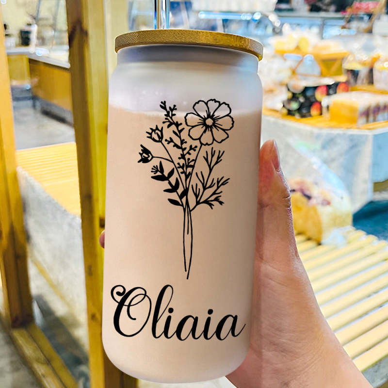Personalized Name Frosted Can Glass with Birth Flower Custom Can Glass with Straw Gift for Mother Friends Family Bridesmaid