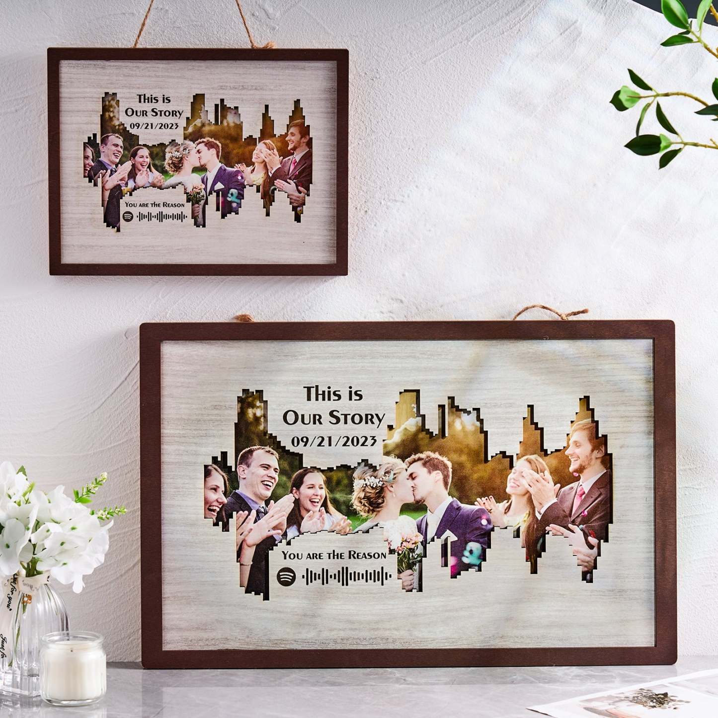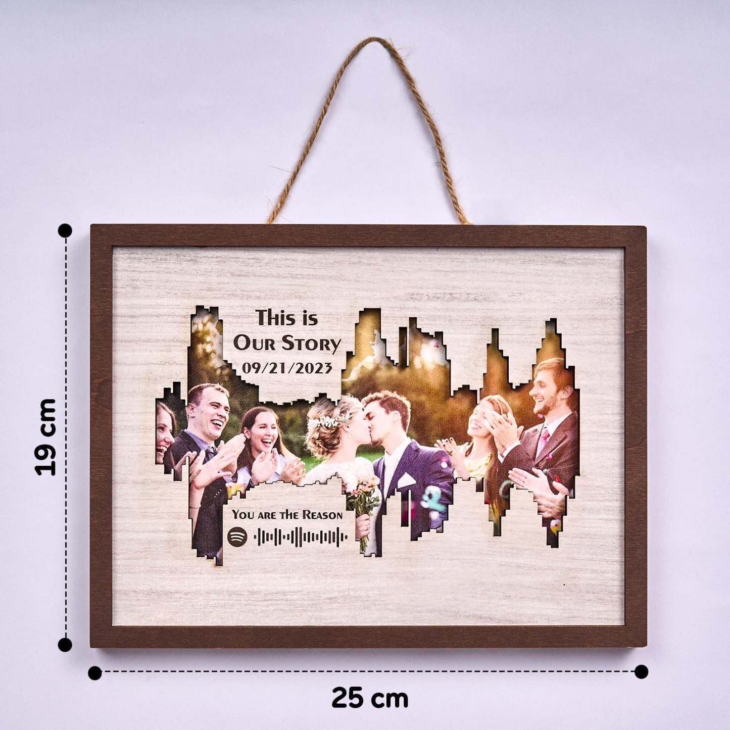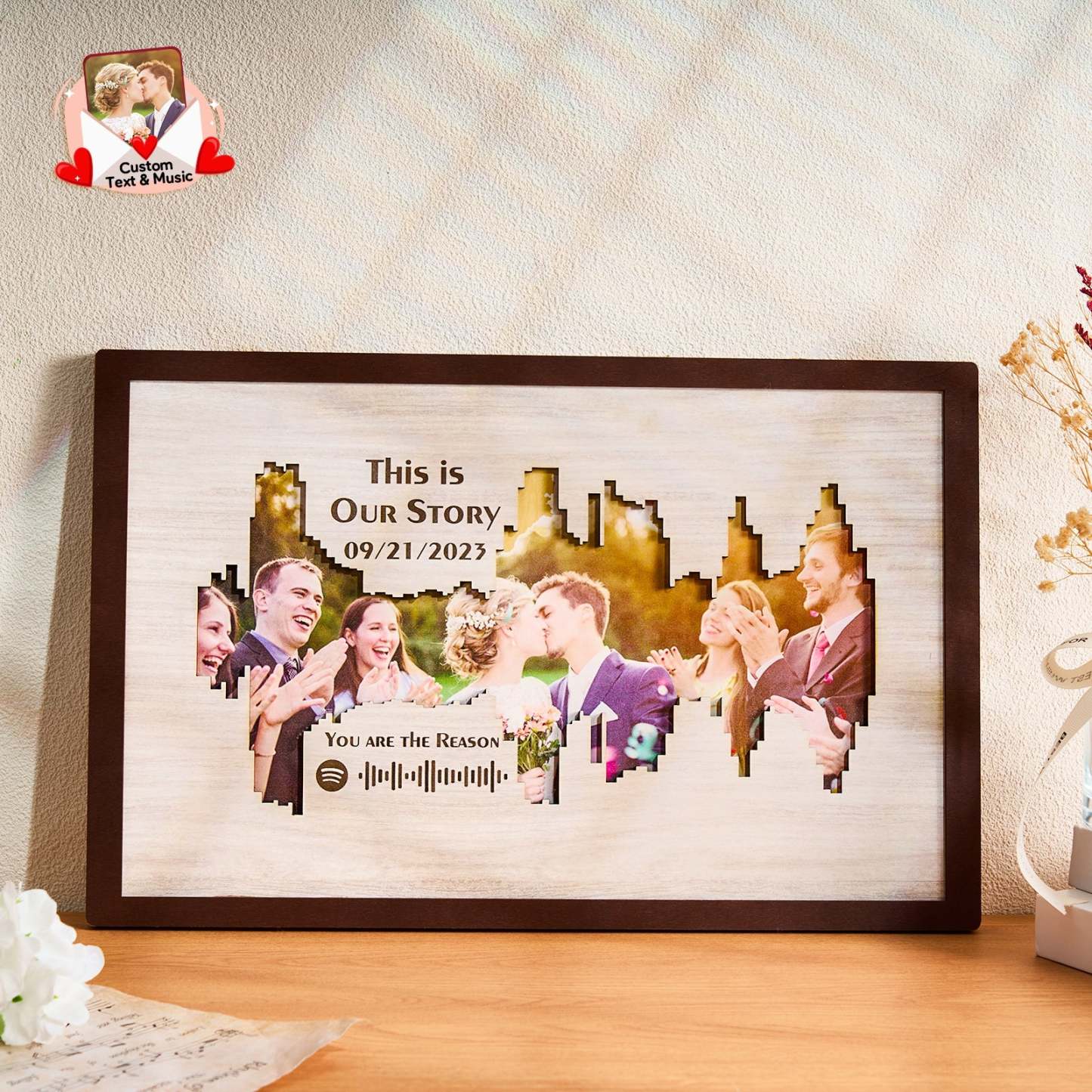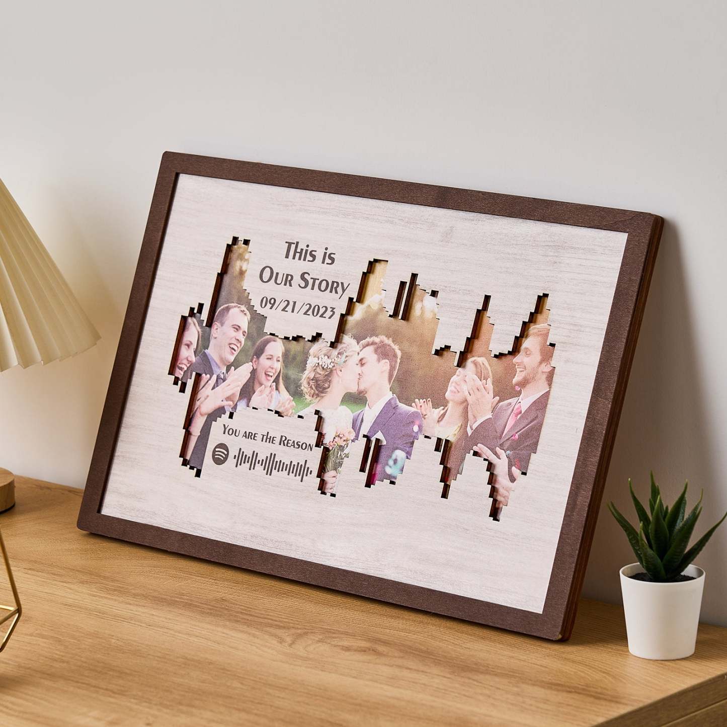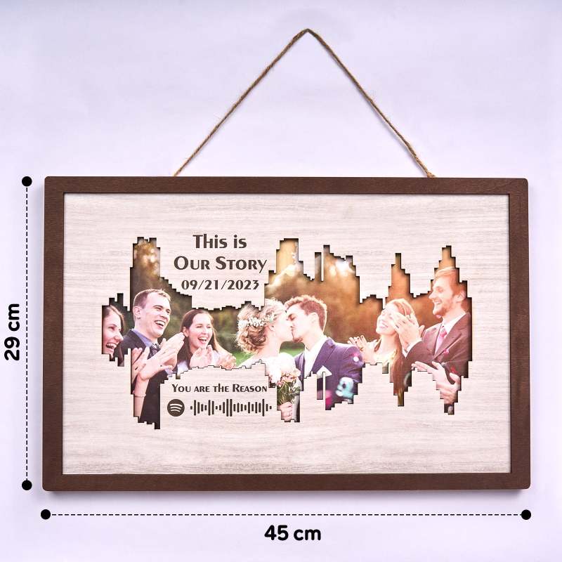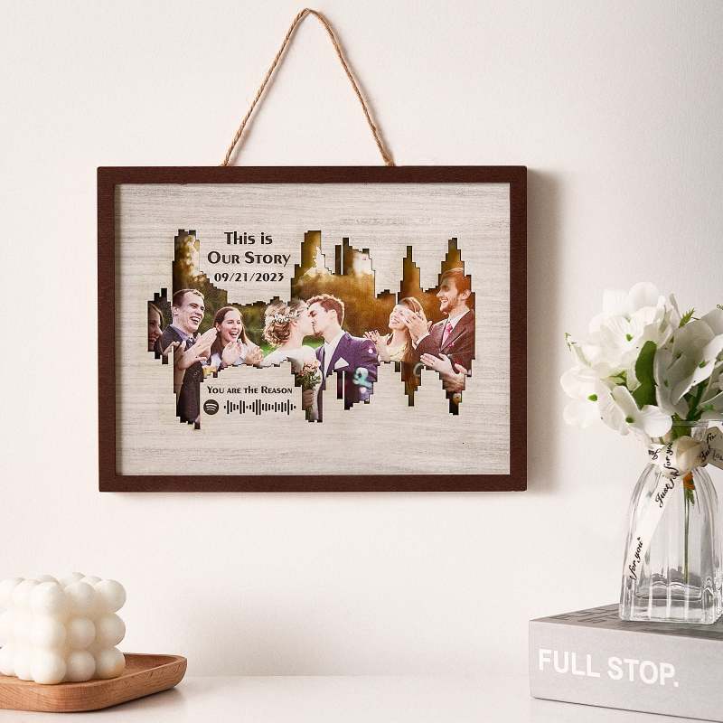 Enhance your home decor with our Personalised Photo Spotify Code Music Sound Wave Shaped Photo Frame. Immortalize your special memory with a unique sound wave shaped custom photo, accompanied by a custom Spotify code, date, and message. The perfect meaningful gift for music lovers.